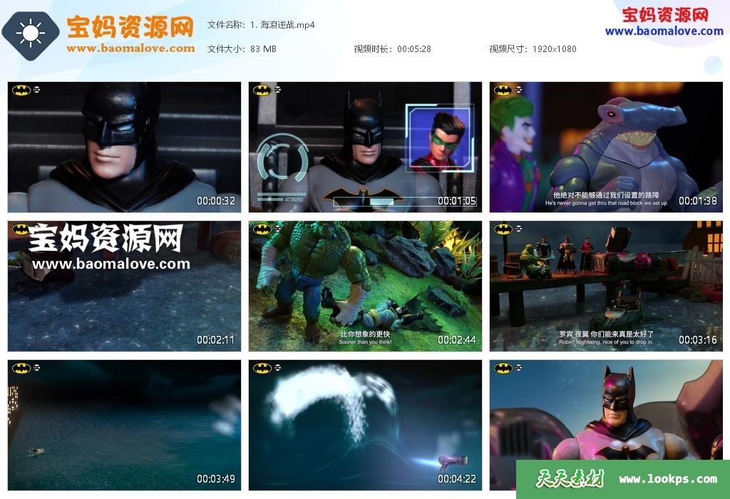 天天资源网收录的动画片《蝙蝠侠 披风战士传奇》,全部25集,国语发音,中英文字幕;每集大小约70M,资源总大小1.82G,单集播放时长约5分钟,1080P高清MP4格式,可以在电视机或电脑、平板、IPAD、早教机、手机等各种设备播放,提供百度云网盘下载。