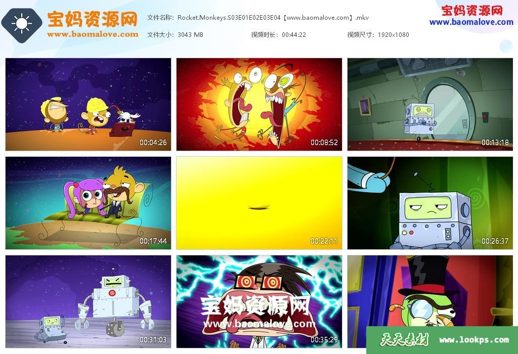 天天资源网收录的动画片《Rocket Monkeys》第三季,全部52集,英语发音,内置英文字幕(可以下载后使用播放器选择字幕或者关闭字幕);资源总大小37.6G,单集播放时长约11分钟,1080P高清MKV格式,可以在电视机或电脑、平板、IPAD、早教机、手机等各种设备播放,提供百度云网盘下载。
