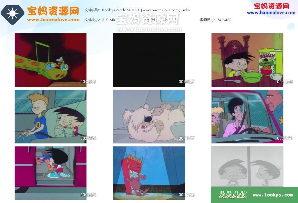 天天资源网收录的动画片《Bobby’s World》鲍比的世界英文版 第一季,全部13集,英语发音,内置英文字幕(可下载后使用播放器选择设置字幕或者关闭字幕);每集大小190M,资源总大小2.5G,单集播放时长约22分钟,480P标清MKV视频格式,可以在电视机或电脑、平板、IPAD、早教机、手机等各种设备播放,提供百度云网盘下载。