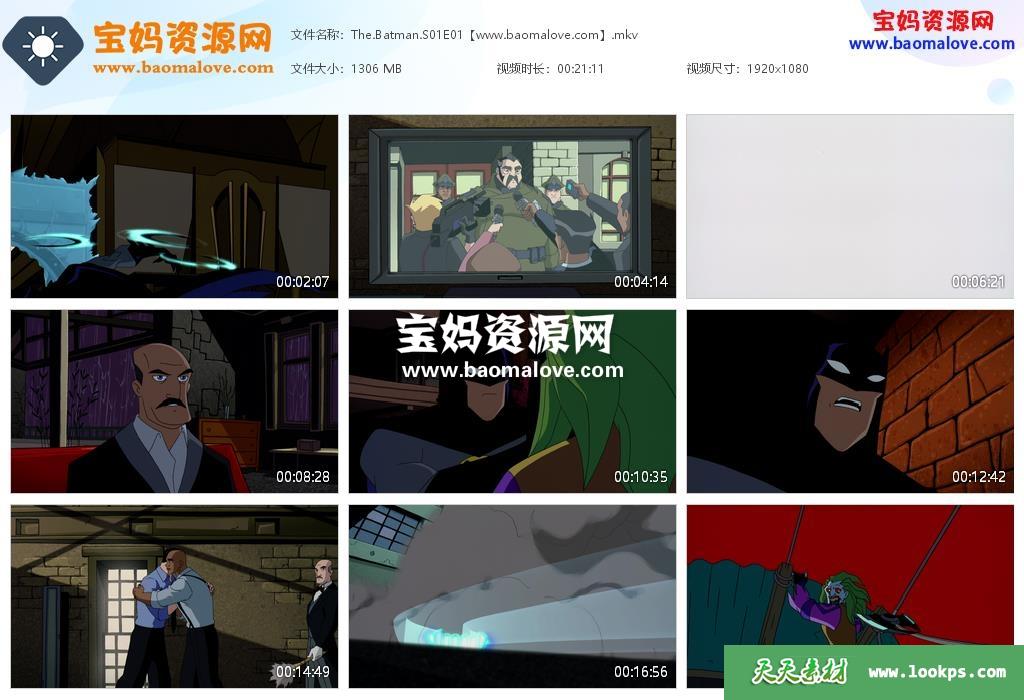 天天资源网收录的动画片《The Batman》新蝙蝠侠英文版 第一季,全部13集,英语发音,内置英文字幕(可以下载后使用播放器设置字幕字体大小颜色或者切换关闭字幕);每集大小约1.25G,资源总大小16.2G,单集播放时长约21分钟,1080P高清MKV视频格式,可以在电视机或电脑、平板、IPAD、早教机、手机等各种设备播放,提供百度网盘下载。