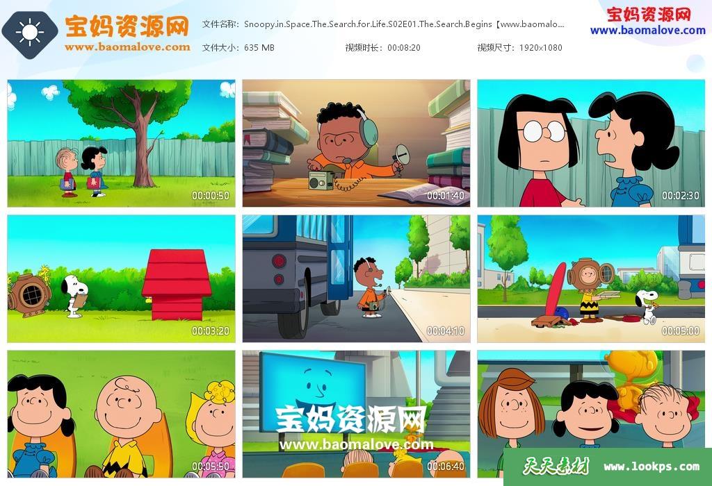 天天资源网收录的动画片《Snoopy in Space》史努比上太空英文版 第二季,全部12集,英语发音,内置英文字幕(内置多国语言字幕,如中文,阿拉伯文,保加利亚文,捷克文,丹麦文,荷兰文,法文,希腊文,匈牙利文,印尼文,意大利文,日文,马来文,俄文,泰文,越南文等,可以下载后使用播放器设置字幕字体大小颜色或者切换关闭字幕);每集大小约635M,资源总大小7.44G,单集播放时长约8分钟,1080P高清MKV视频格式,可以在电视机或电脑、平板、IPAD、早教机、手机等各种设备播放,提供百度网盘下载。