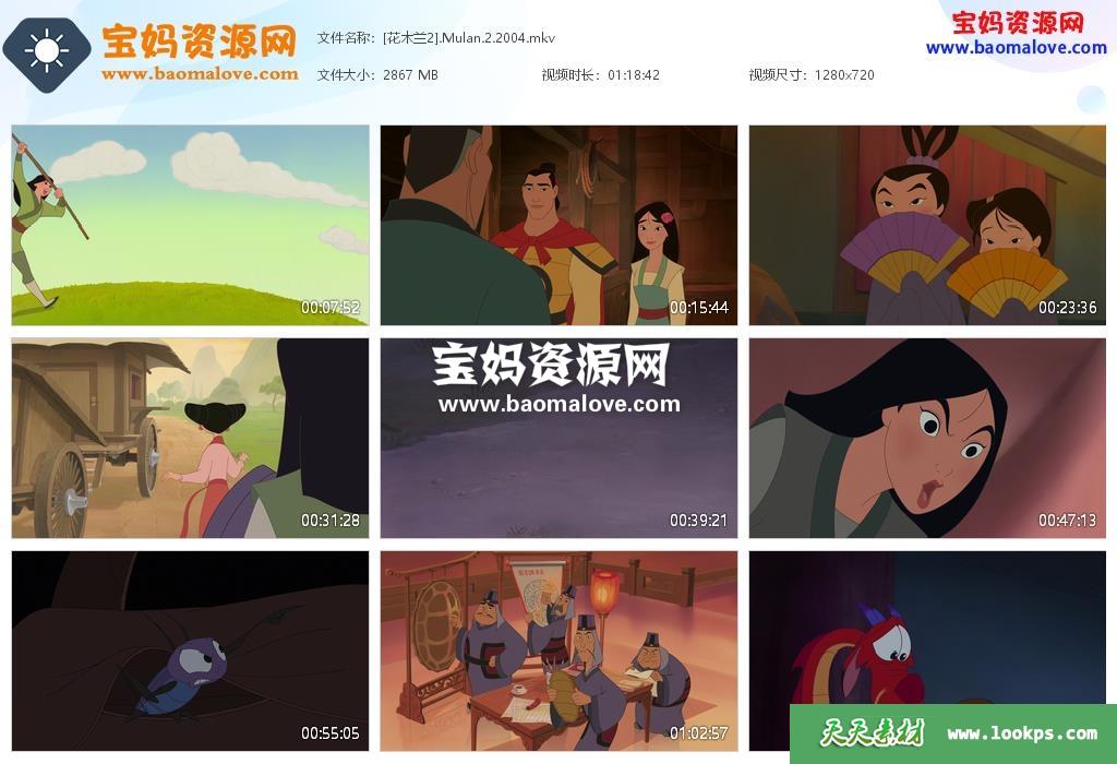 天天资源网收录的动画电影《花木兰2 Mulan II》,国语/粤语/英语三语发音,内置中英文字幕(可以下载后使用播放器选择设置字幕或者关闭字幕);资源大小约2.79G,720P高清MKV视频格式,可以在电视机或电脑、平板、IPAD、早教机、手机等各种设备播放,提供百度云网盘下载。