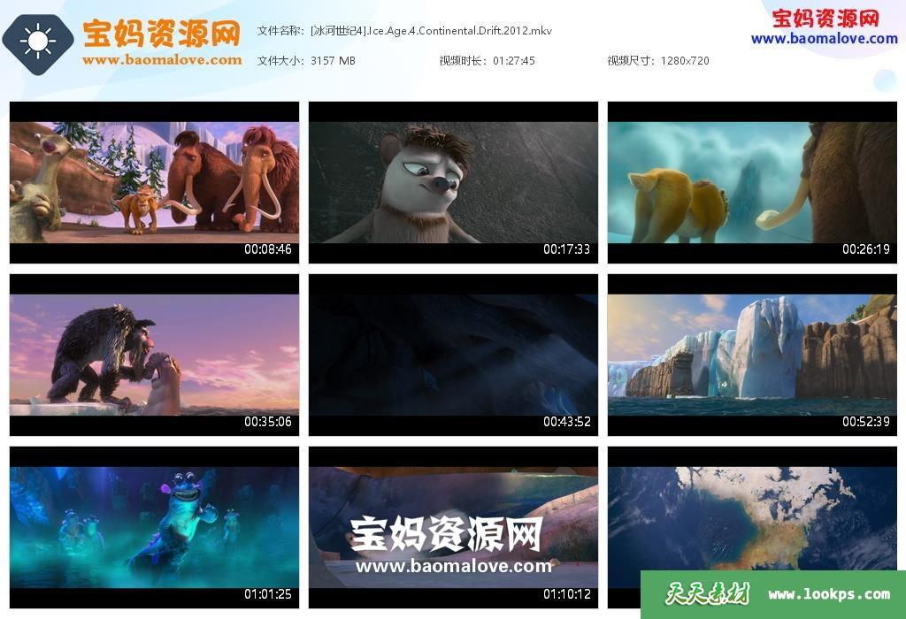 天天资源网收录的动画电影《冰川时代4 Ice Age: Continental Drift》,国粤台英四语发音,内置中英文字幕(可以下载后使用播放器选择设置字幕或者关闭字幕);资源大小约3.08G,720P高清MKV视频格式,可以在电视机或电脑、平板、IPAD、早教机、手机等各种设备播放,提供百度云网盘下载。