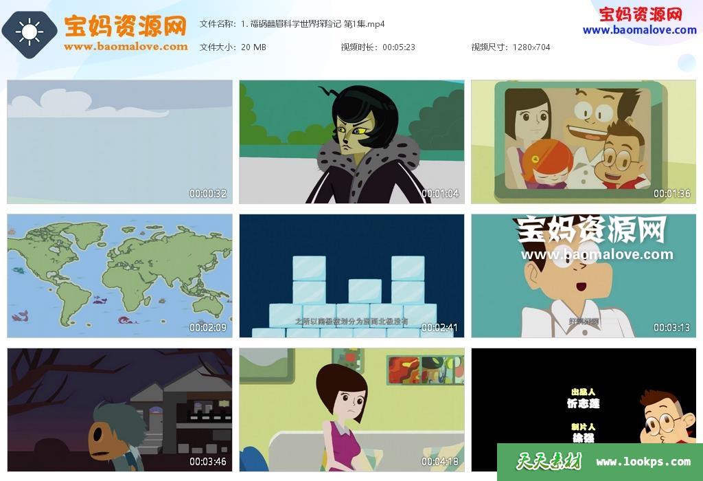 天天资源网收录的动画片《福锅囍眉科学世界探险记》 ,全部200集,国语发音,中文字幕;每集大小约21M,资源总大小约4.13G,单集播放时长约5分钟,704P高清MP4视频格式,可以在电视机或电脑、平板、IPAD、早教机、手机等各种设备播放,提供百度网盘下载。