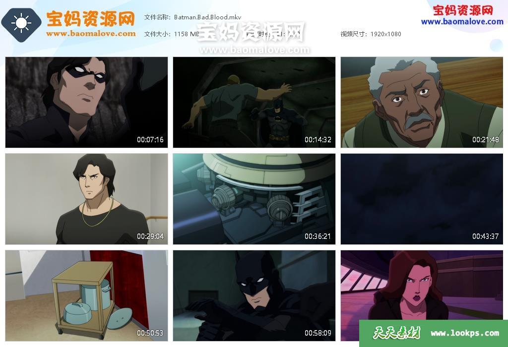 天天资源网收录的动画电影《蝙蝠侠:血脉恩仇 Batman: Bad Blood》,英语发音,内置英文字幕(可以下载后使用播放器设置字幕字体大小颜色或者切换关闭字幕);H265视频编码,资源大小约1.13G,1080P高清MKV视频格式,可以在电视机或电脑、平板、IPAD、早教机、手机等各种设备播放,提供百度云网盘下载。