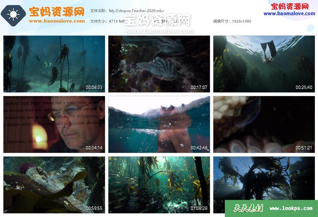 天天资源网收录的纪录片《我的章鱼老师 My Octopus Teacher》,全部1集,英语发音,内置中英文字幕(内置多国语言字幕,可以下载后使用播放器选择字幕或者关闭字幕);资源总大小4.6G,单集播放时长约85分钟,1080P高清MKV视频格式,可以在电视机或电脑、平板、IPAD、早教机、手机等各种设备播放,提供百度云网盘下载。