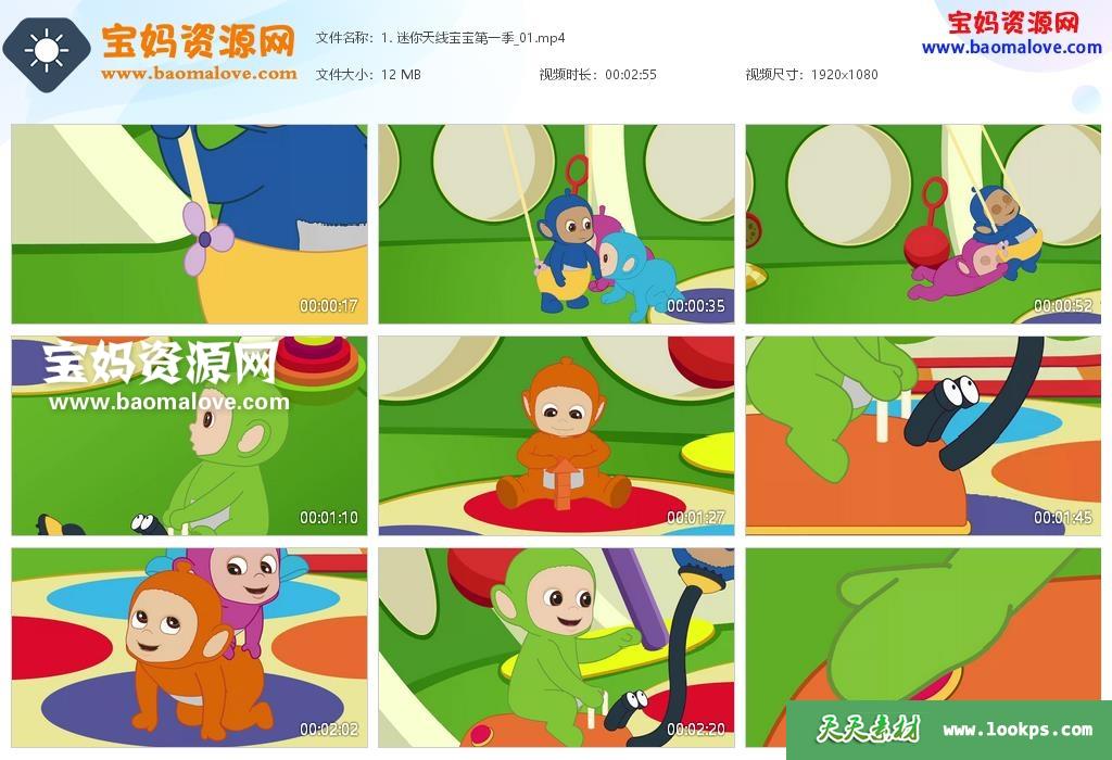 天天资源网收录的动画片《迷你天线宝宝 The Tiddlytubbies》,全部50集,默片无对白,无字幕;资源总大小约874M,单集播放时长约2~3分钟,1080P高清MP4视频格式,可以在电视机或电脑、平板、IPAD、早教机、手机等各种设备播放,提供百度云网盘下载。