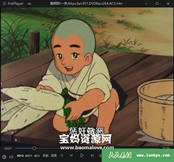 天天资源网收录的动画片《聪明的一休 天艺版》,全部150集,国日双语发音,内置中文字幕(可以下载后使用播放器选择设置字幕或者关闭字幕);资源总大小约50.8G,单集播放时长约25分钟,576P标清MKV视频格式,可以在电视机或电脑、平板、IPAD、早教机、手机等各种智能设备播放,提供百度云网盘下载。