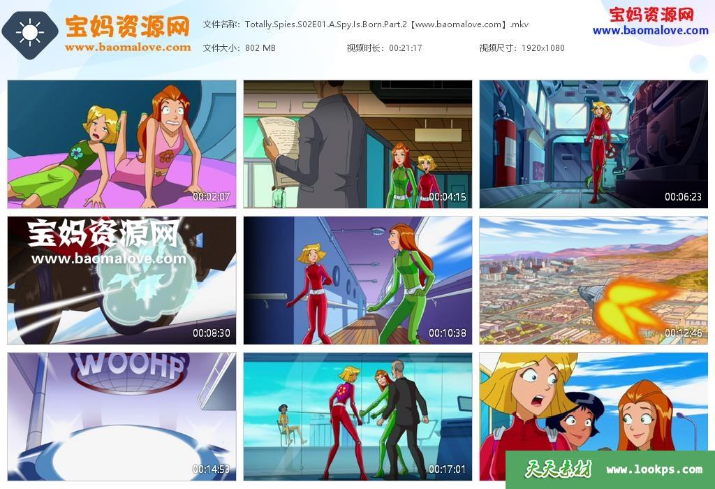 天天资源网收录的动画片《Totally Spies!》间谍少女组英文版 第二季,全部26集,英语发音,内置英文字幕(可以下载后使用播放器选择字幕或者关闭字幕);资源总大小约30.8G,单集播放时长约22分钟,1080P高清MKV视频格式,可以在电视机或电脑、平板、IPAD、早教机、手机等各种智能设备播放,提供百度云网盘下载。
