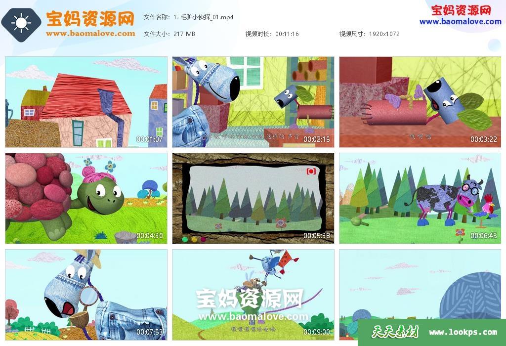 天天资源网收录的动画片《毛驴小侦探》,全部52集,国语发音,中文字幕;资源总大小约10.8G,单集播放时长约11分钟,1080P高清MP4视频格式,可以在电视机或电脑、平板、IPAD、早教机、手机等各种智能设备播放,提供百度云网盘下载。