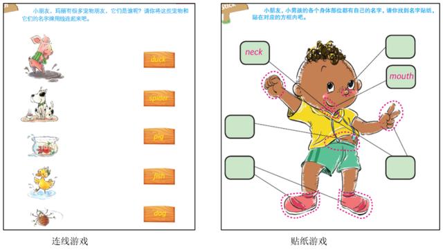 常用词和高频词汇是英语阅读的基础,这套书格外注重这方面的积累。每套书中都配有《游戏册》和《亲子导读》,《游戏册》里经常出现的游戏,就是看实物找单词的连线游戏;反过来,也有对应实物帖上单词贴纸的游戏。这样的游戏可以帮助孩子将实物与单词的形和音联系起来,做到眼见即认,积累词汇量,形成英语思维。每个故事设置了3-4个不同形式的游戏,通过做游戏,进一步理解故事情节,加深学习效果。