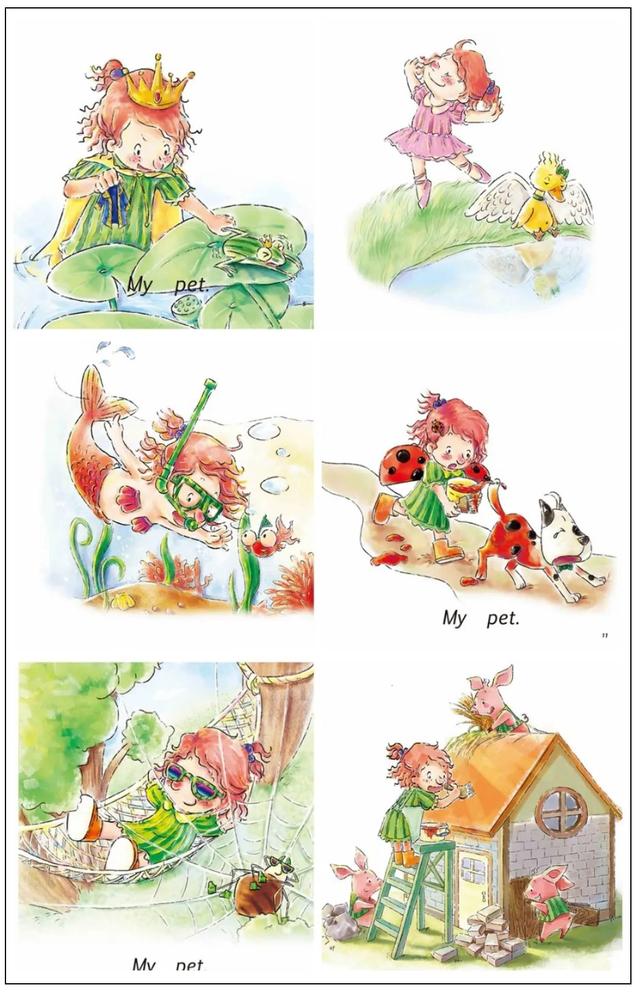 比如第1级中的《My Pets》,这个故事主要讲述了一个叫玛丽的小女孩和她的一群宠物朋友的故事。故事的内容非常简单易懂,采用重复式的短句形式进行设计,特别适合初次接触英语的孩子。但是,我们细看画面内容,会发现,每一页的设计都别有洞天,隐藏着更多的故事有待发觉。