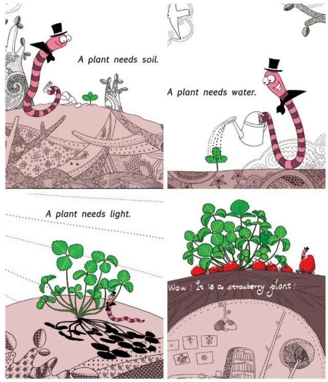 第2级中的《How Does A Plant Grow?》看起来是个严肃的科普内容,但是,它用了蚯蚓先生从发现一颗种子,然后播种、浇水等细心照顾植物茁壮成长的故事进行巧妙串联,让孩子们体会到了植物生长过程中、泥土、水、阳光等因素的重要。故事徐徐展开,孩子们随着植物的成长,和蚯蚓先生一样充满了期待和自豪,待花开结果,看到那颗娇艳欲滴的草莓,相信每个孩子都会会心一笑,甚至可能会轻轻吧嗒下嘴巴,感受到它的甜美。