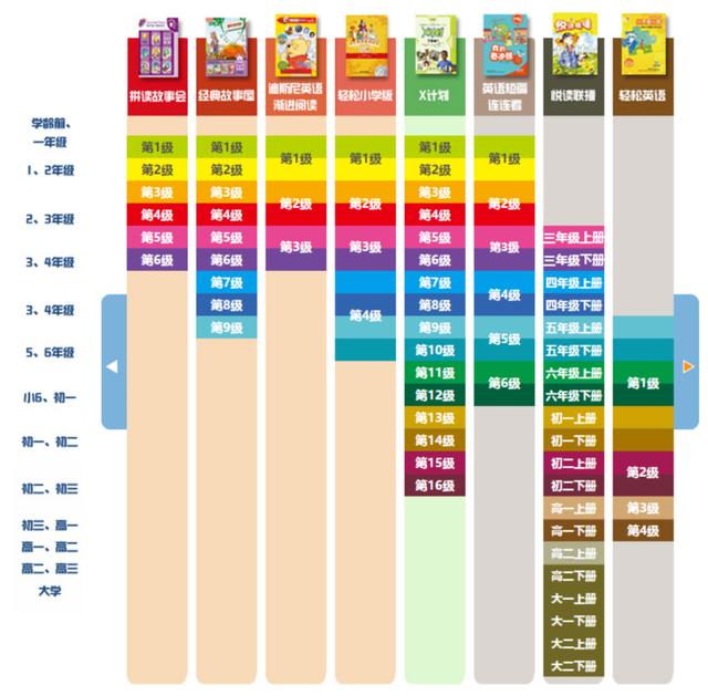 外研社英语分级标准参考英语母语国家分级标准,集众家之长,专为中国孩子进行第二外语学习而设置的一套科学、严谨、系统的分级标准,我们非常熟悉的《丽声》、《书虫》系列也同样属于这个分级标准之下。