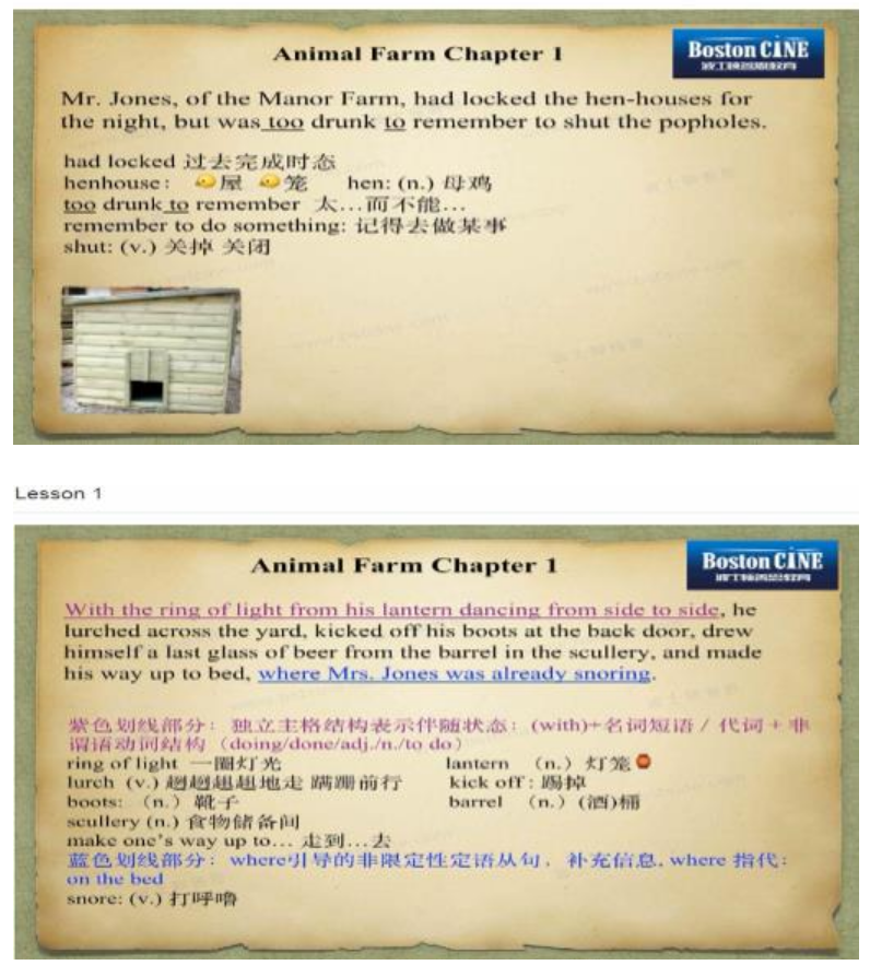 课程简介本套《动物庄园》英文原版导读精讲视频课程全集,由邱巍楠(Nancy)老师讲课,共38小讲,《动物庄园 Animal Farm》是一本史诗般的经典,她值得所有人去读,并且值得反复阅读。虽然以寓言的形式出现,但其思想之深、涉及历史事件之广,超乎绝大多数读者之想象。可以毫不夸张地说,把动物农庄读懂读透,收获的远不止英语的基本语法结构和两千多个词汇,还包括欧洲现代史和各种政治思潮、并促使我们去深入思考诸如平等、真实等概念.